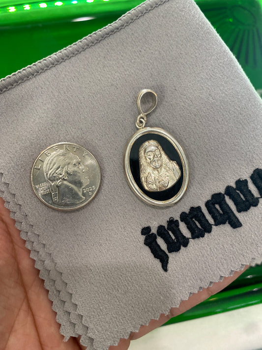 .925 Sterling Silver Oval Onyx Jesus Head Pendant