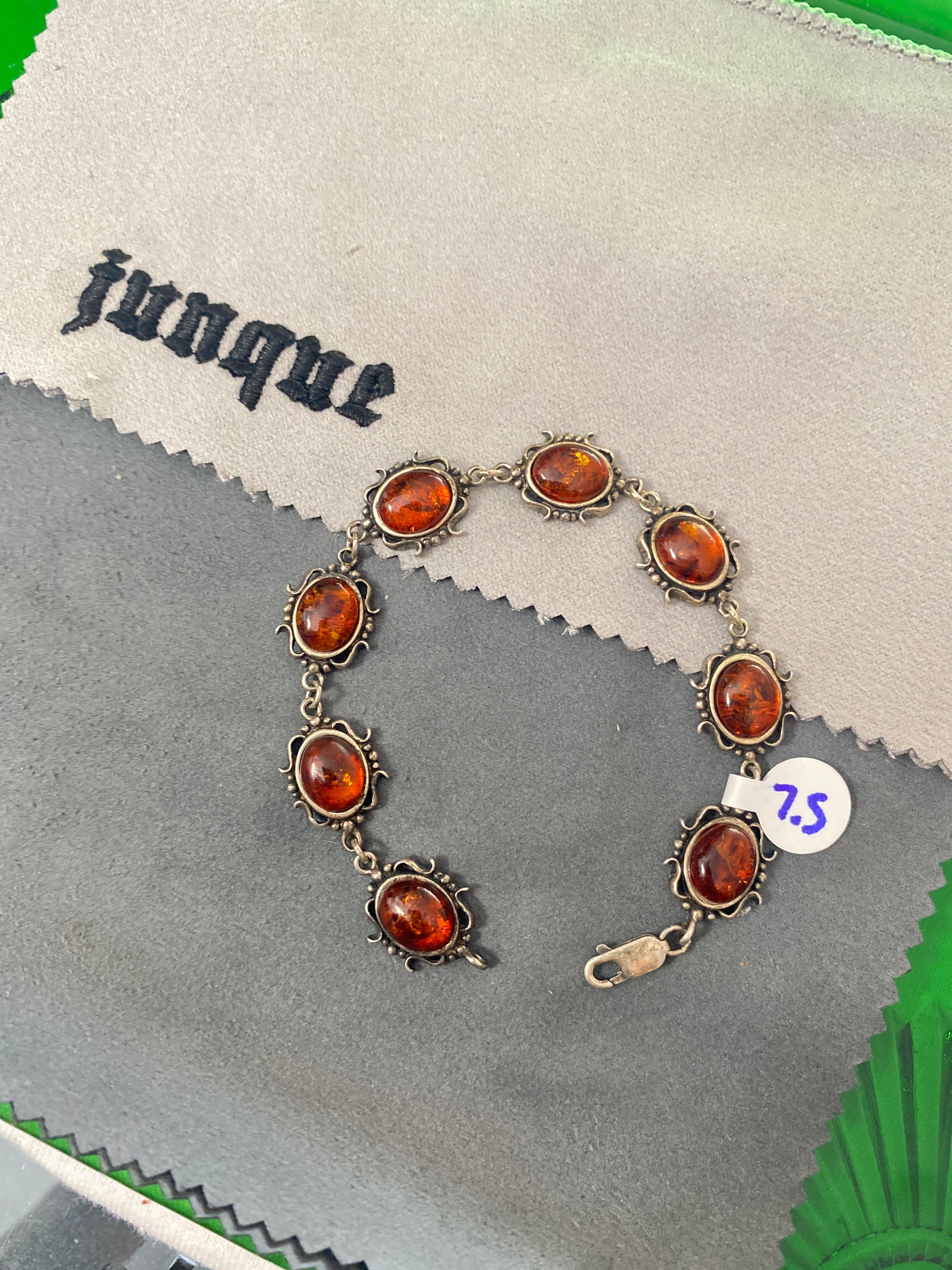 .925 Sterling Silver Amber Floral Link Bracelet Sz 7.5”