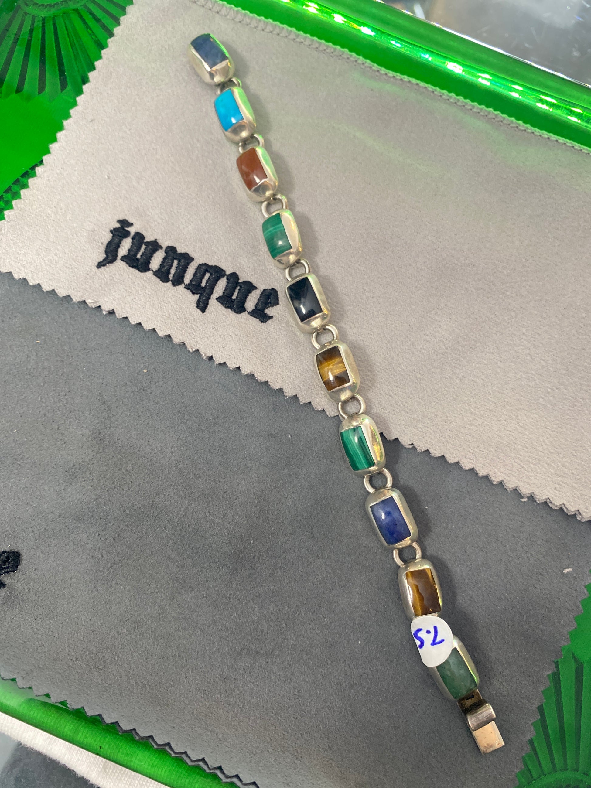 .925 Sterling Silver Multi Gemstone heavy Block Link Bracelet Sz 7.5”