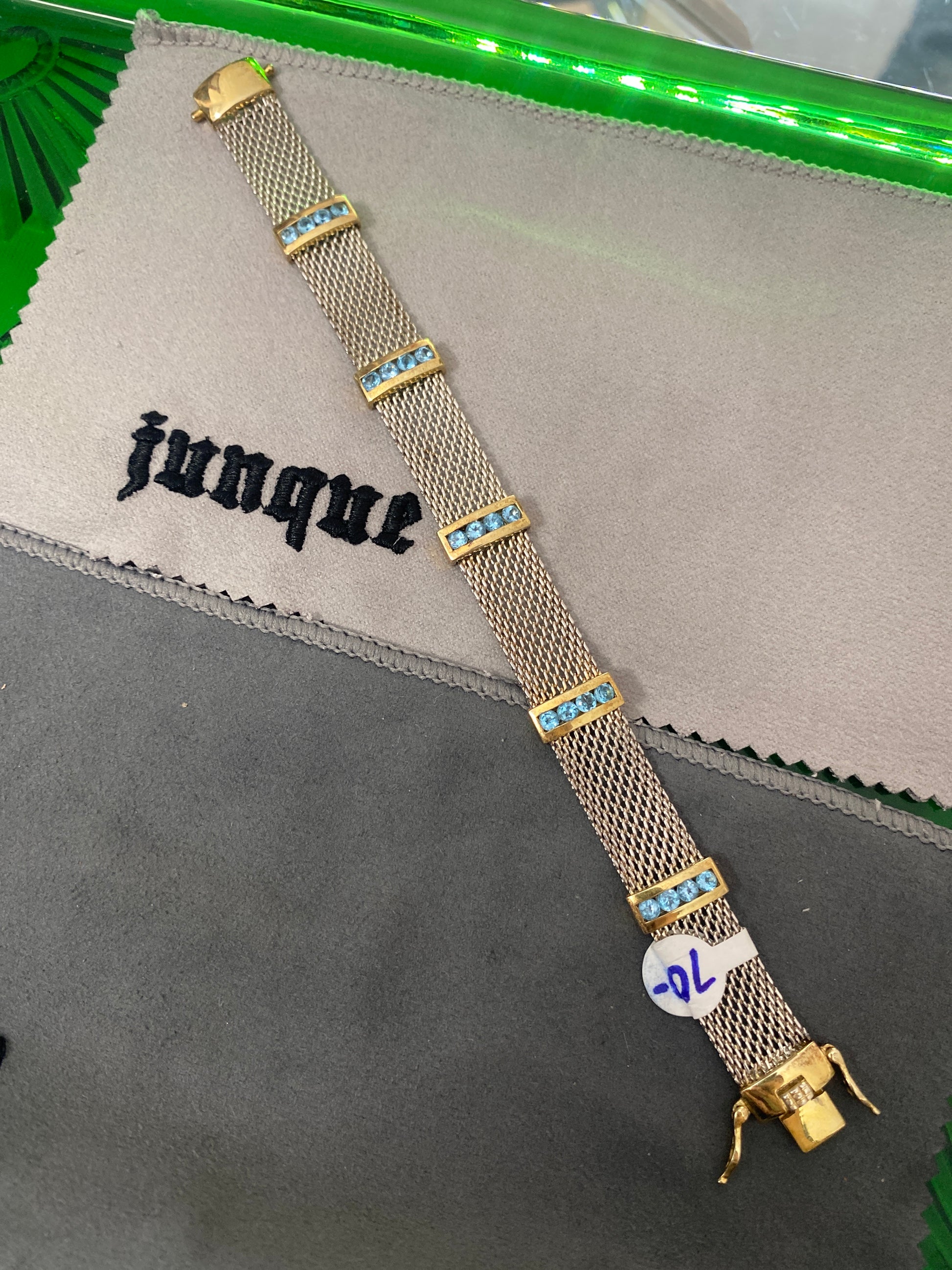 .925 Sterling Silver Weave Gold Tone Aqua Marine Bracelet Sz 7.5